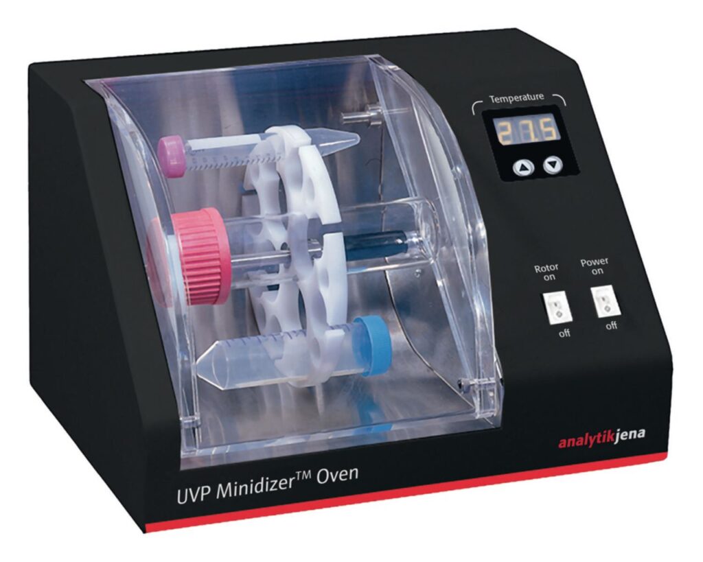 Various hybridization ovens: UVP Hybridizer, UVP Hybrilinker, UVP Multidizer, and UVP Minidizer with high-capacity carousels allow incubation of several bottles or tubes in parallel.