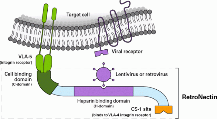 Činidlo RetroNectin je rekombinantní fragment lidského fibronektinu, který zvyšuje účinnost transdukce genů zprostředkované lentiviry a retroviry. Obsahuje tři funkční domény – doménu vázající buňky, doménu vázající heparin a sekvenci CS-1. Virové částice vážou činidlo RetroNectin prostřednictvím interakce s H-doménou a cílové buňky se vážou především prostřednictvím interakce integrinových receptorů buněčného povrchu VLA-5 a/nebo VLA-4 s fibronektinovou C-doménou a místy CS-1.